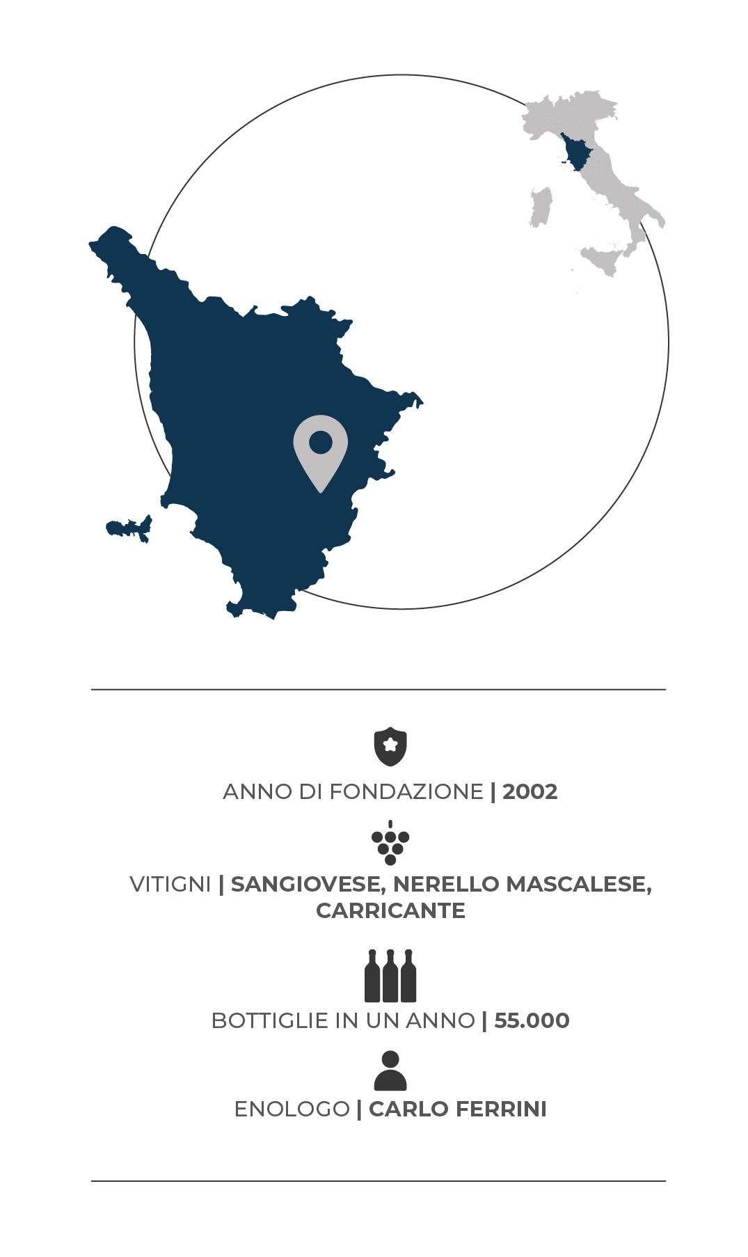 TIPOLOGIADOCG Brunello di Montalcino ZONA PRODUTTIVAMontalcino (SI), a 360 metri s.l.m., in circa 4 ettari totali di vigne atte a Brunello VITIGNO100% Sangiovese TIPOLOGIA DEL TERRENOMedio impasto ricco di scheletro VINIFICAZIONE20 giorni di contatto con le bucce, di cui 9 giorni di fermentazione alcolica, in tini d’acciaio e cemento. Délestage a metà fermentazione SISTEMA DI ALLEVAMENTOCordone speronato COLORERosso rubino brillante e profondo PROFUMOAl naso spiccca un frutto rosso nitido, unito ad accenti floreali e una vena più terrosa; poi spezie fini e richiami balsamici che aggiungono profondità senza appesantire ABBINAMENTIPerfetto insieme ad arrosti e brasati, carni rosse, selvaggina non troppo speziata, primi al ragù ricco, funghi e formaggi stagionati SAPORESorso tonico e scattante, con freschezza ben presente e tannino preciso, di grana fine. Ha un passo agile e vivace, ma resta profondo e persistente, con una chiusura pulita INVECCHIAMENTOCirca 30 mesi in botti di legno da 500, 700 e 2,500 lt. Seguiti da un passaggio di circa 6 mesi in cemento e 18 mesi in bottiglia.