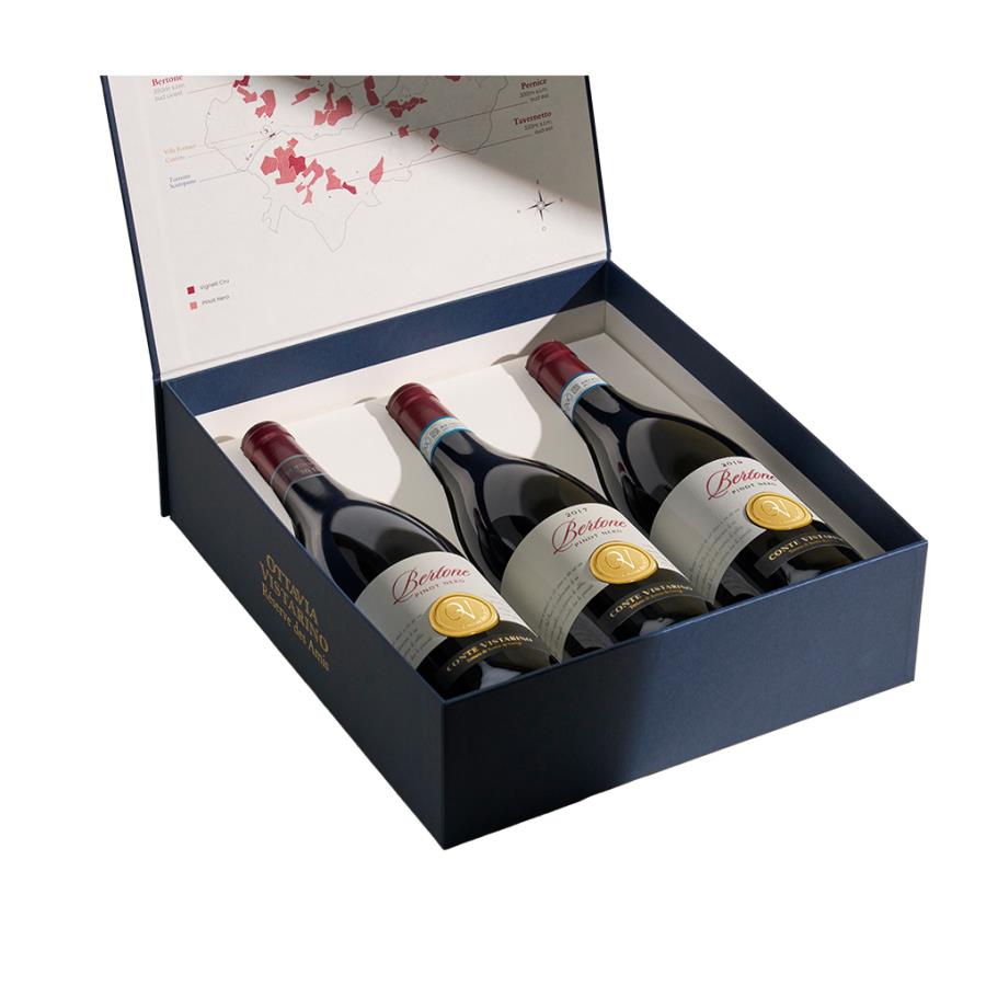 TIPOLOGIADOC Oltrepò Pavese ZONA PRODUTTIVAOltrepò Pavese. Singolo vigneto di 1.5 ha posto a 400 m.s.l.m con esposizione sud/sud-ovest. VITIGNO100% Pinot Nero TIPOLOGIA DEL TERRENOSuolo argilloso-calcareo con buona presenza di sabbia e limo. VINIFICAZIONELe uve sono raccolte manualmente in cassette da 20 kg e poste in cella frigo a 10°C per una notte. L'indomani mattina i grappoli, dopo una selezione manuale, sono diraspa-pigiati e il pigiato è caricato per gravità in tini tronco-conici di rovere. Dopo una macerazione a freddo di 48 h (10°C) parte la fermentazione alcolica con periodiche follature manuali per circa 10/12 giorni a 25-28°C. SISTEMA DI ALLEVAMENTOGuyot COLORERosso rubino profondo con tipici riflessi granata. PROFUMOProfumo complesso, ampio con profumi di viola e piccoli frutti rossi, caffè tostato e cacao. Grande integrità del frutto. SAPOREGusto elegante, di corpo, con frutto integro ed evidente, equilibrato con una piacevole mineralità e un finale lungo e speziato. NOTECofanetto speciale in edizione limitata con 3 annate del Cru di Pinot Nero Bertone selezionate da Ottavia Vistarino. INVECCHIAMENTOIl vino viene affinato in barriques di rovere francese per 12 mesi, dove viene svolta la fermentazione malolattica la primavera successiva alla vendemmia. Dopo l'imbottigliamento il vino sosta un ulteriore anno in bottiglia prima della commercializzazione.